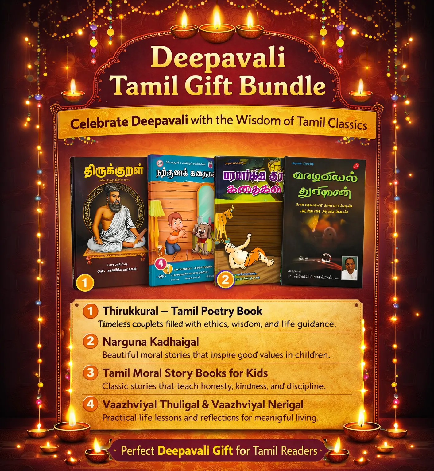 The Deepavali Tamil Gift Bundle is a meaningful collection of Tamil books that celebrates culture, values, and wisdom—making it a perfect festive gift for children. This bundle combines literature, moral stories, and life lessons to inspire young minds during the joyous occasion of Deepavali.