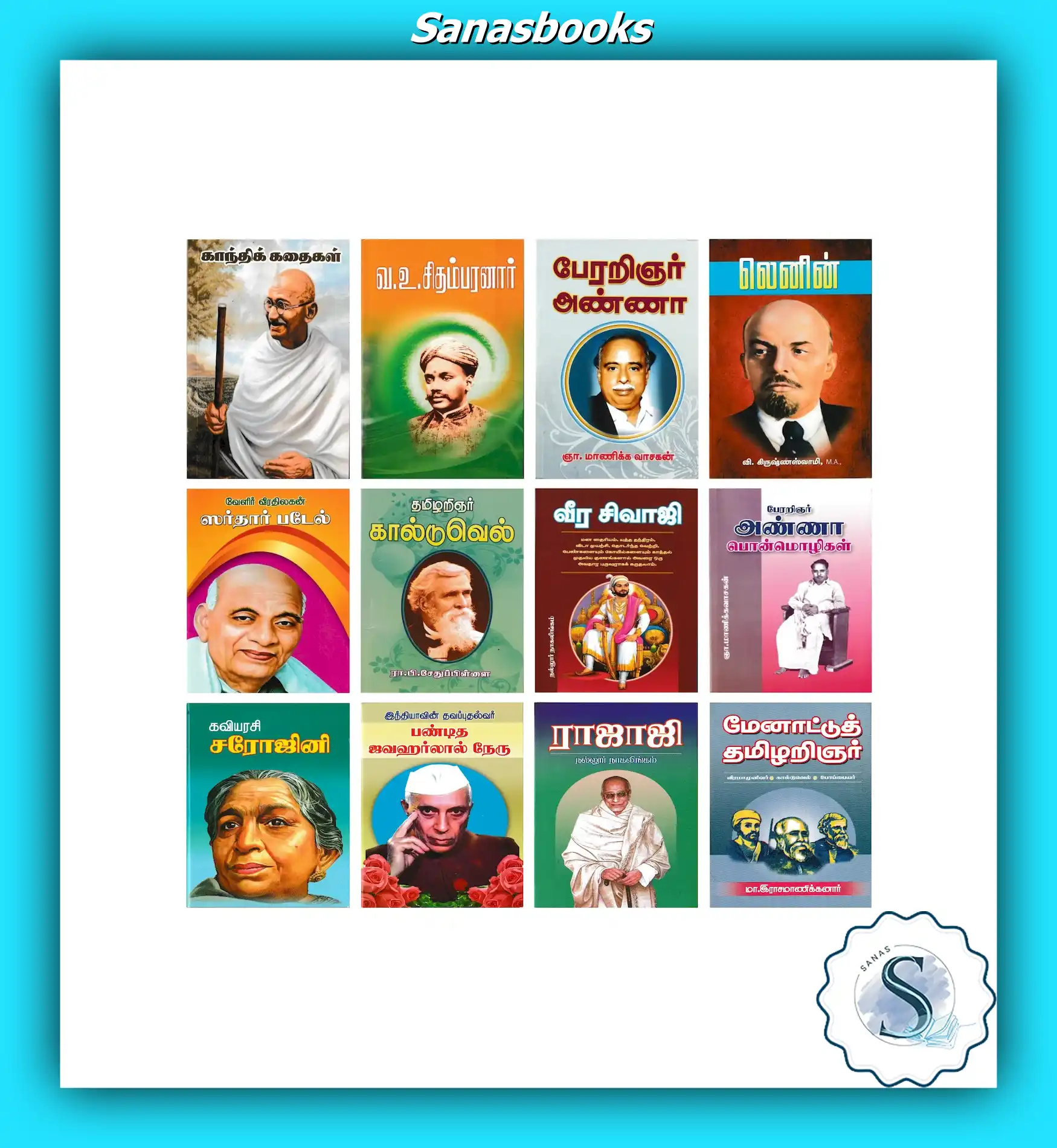 This Tamil Biography Books collection features 12 well-known titles including Gandhi Kadaigal, Va.Vu. Chidambaranar, Perarignar Anna, Vladimir Lenin, Tamil Arignar Caldwell, Sardar Patel, Veera Sivaji, Perarignar Anna Ponmozhigal, Kavi Arasi Sarojini, Jawaharlal Nehru, Rajaji, and Maynaatu Tamizhargal.