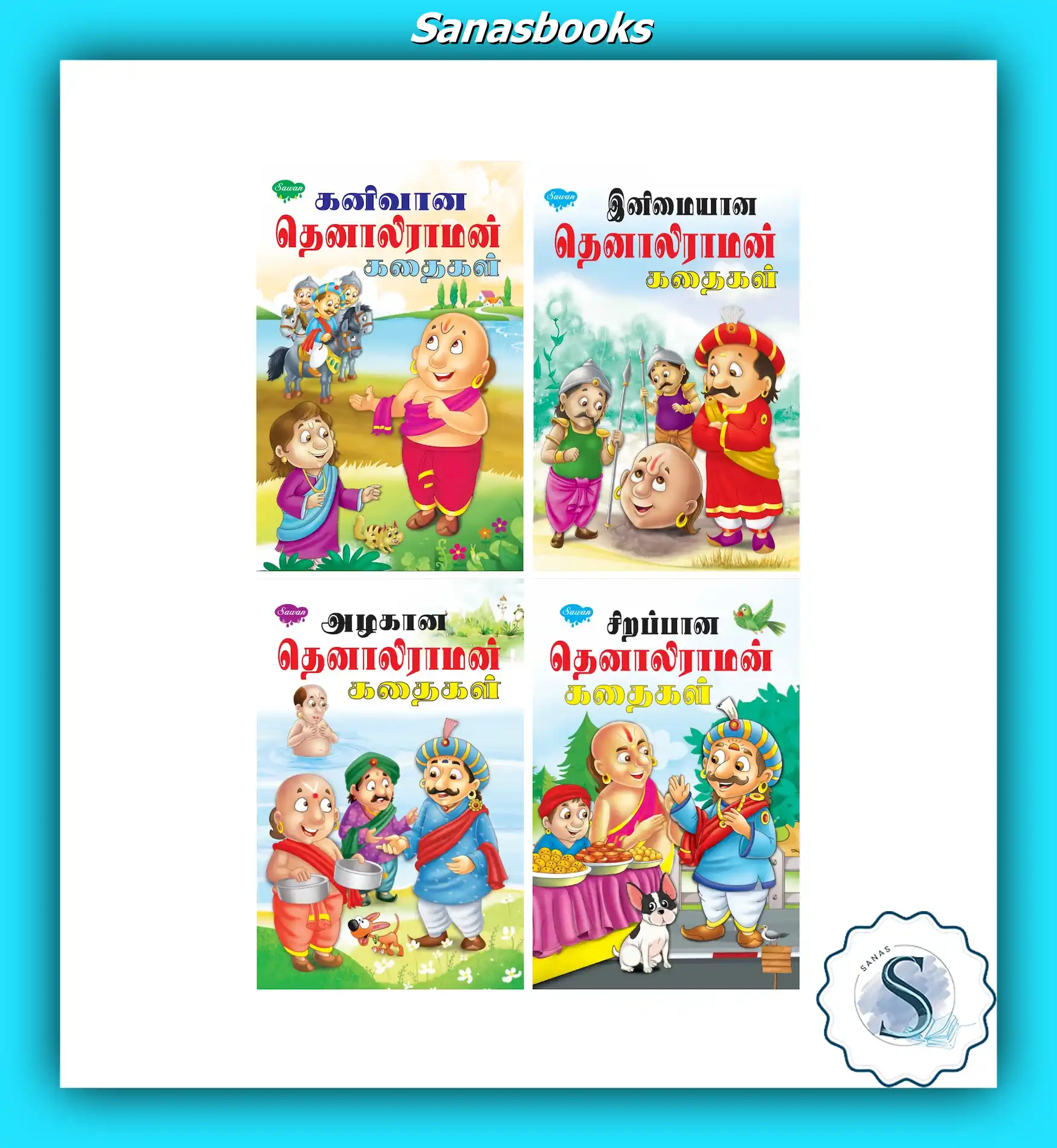 This Tamil story books set features four delightful titles: Kanivaana, Inimaiyaana, Azhagaana, and Sirapana Tenali Raman Kathaigal.